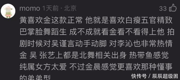 有网友表示黄景瑜喜欢金晨很正常,因为他的额理想型就是又白又瘦、五官精致、巴掌脸的舞蹈生。但这位网友认为两人能够成为一对,得看金晨是否看得上黄景瑜。该网友表示黄景瑜很是“多情”。之前拍戏时候就曾对吴谨言动手动脚,对李沁也十分热情。而金晨、吴谨言、以及之前和黄景瑜传过绯闻的张艺上都是北舞相关出身。