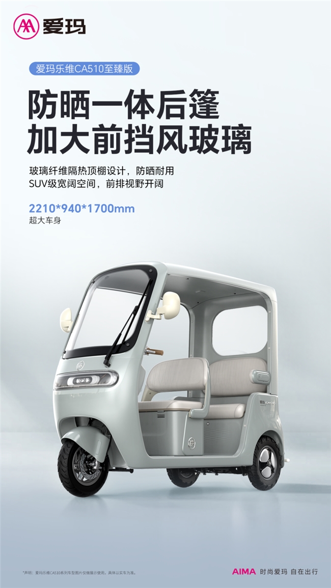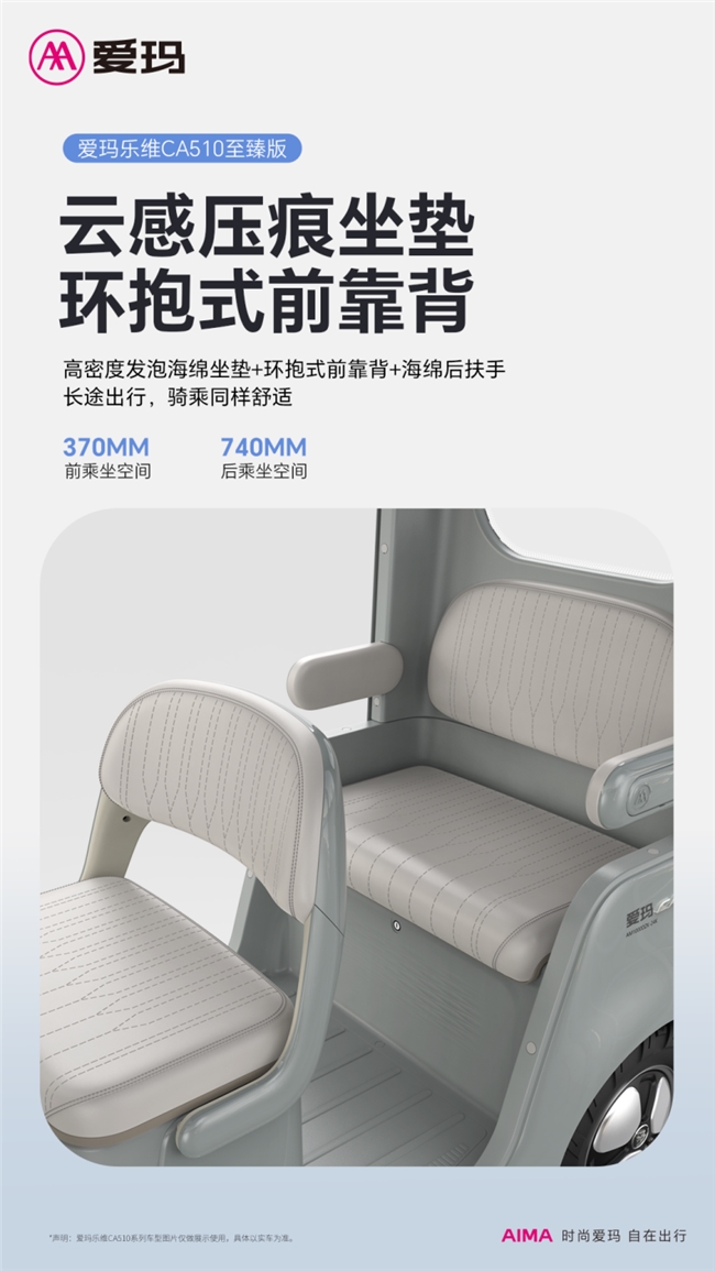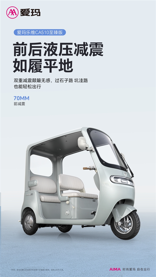 不仅如此,为了让“银发一族”能够享有更加轻松、多样的出行体验,爱玛乐维 CA510至臻版通配60/72V32Ah电池,最大可装60V45Ah电池,续航里程更远;采用灵敏度更高的前碟刹后鼓刹配置,制动效果更强,前200mm大盘碟刹与3.5-10防滑大宽胎,崎岖湿滑如履平地,制动灵敏无虞;800mm超宽后轮距,转弯不晃不飘;70mm前减震行程,石子坑洼不在话下;爱玛出行APP,车机互联,一键控车,说走就走。凡此种种,无不是旨在提升骑乘感受,带给“银发一族”以全方位的出行体验升级。
