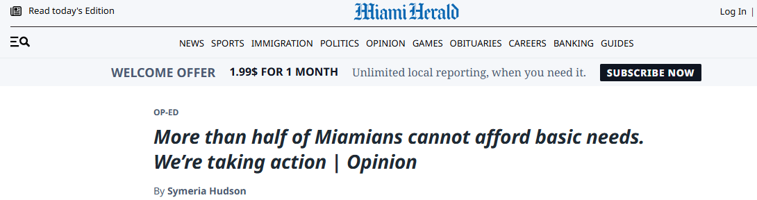 文章表示,在迈阿密,现实令人清醒:戴德县超过五十万个家庭难以负担住房、食品、医疗、托儿、交通和技术等必需品和服务。家庭收入与实际生活成本之间的差距持续扩大。西默里亚·哈德森在文中强调,这些挑战并非抽象概念。当家庭被迫在支付房租和喂养孩子之间作出选择时,这并非个人失败,而是系统性问题。这需要企业领导者、政策制定者、教育者、医疗系统、非营利组织和普通公民共同努力。