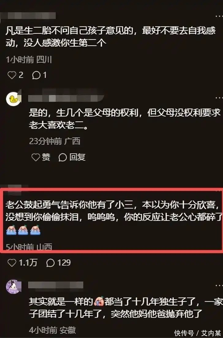 网友表示,这比婚内出轨还恶心。这位妈妈想一想,如果有一天孩子爸爸回来说,我给你找了个小三妹妹陪你,你们好好相处,哎呀,你怎么不开心呢,我都鼓起勇气告诉你了!