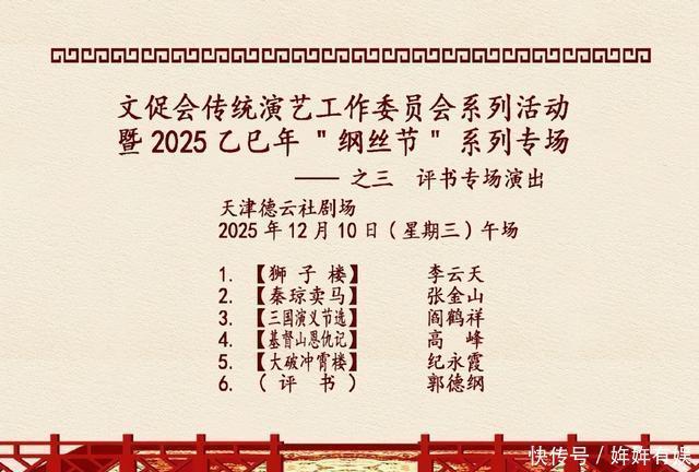 这场演出的主题很长,“文促会传统演艺工作委员会系列活动暨2025乙巳年“纲丝节”系列专场之三评书专场演出”。 当天演出,估计应该会有这么一长条幅,挂在天津德云社小剧场舞台上方的。 演出安排在12月10日,天津德云社午场。这是“纲丝节”第三天。当晚,在天津中华剧院,有“相声来了”专场。其中石富宽、杨威的加盟已经引起了大家的关注。 一天,两场大型演出,小剧场一场,天津中华剧院一场。若能同时抢到两场演出的门票,那抢到票的观众可是太幸福了。